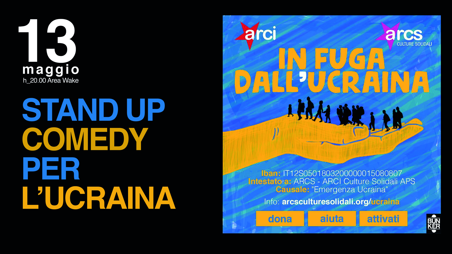 Per chi non potrà partecipare allo spettacolo c'è comunque la possibilità di contribuire con un bonifico bancario intestato a ARCS – ARCI Culture Solidali APS, indicando la causale “EMERGENZA UCRAINA”, al seguente Iban: IT12S0501803200000015080807.